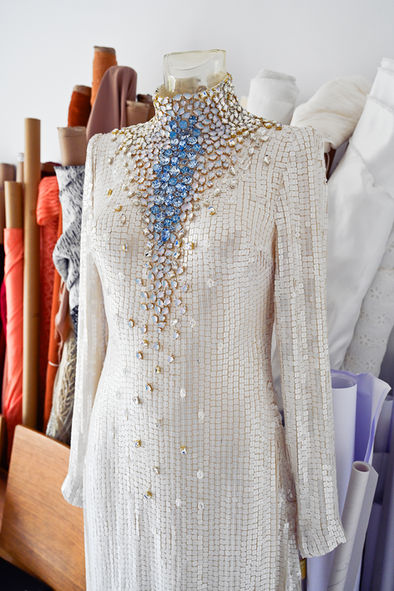 Dans son atelier, les techniques de haute couture n’ont pas changées et la plupart du travail de confection se fait à la main. Chaque vêtement est envisagé comme une pièce d’architecture dont la ligne doit rester pure et précise, comme en témoignent ses innombrables dessins qui ornent les murs de son atelier. Mais il devient aussi un concept à réétudier par le prisme d’un thème ou d’une idée, aussi abstraite soit-elle. A travers ses collections dévoilées sur la scène de la mode à Paris et Londres depuis 2022, Sara Chraïbi nous offre une évasion dans l’imaginaire poétique des mythes. Pour son dernier défilé Les Cieux, la créatrice nous embarque dans une ascension spirituelle de la terre au ciel. Le thème fut inspiré par les mentions du ciel dans les textes sacrés de la religion musulmane. Marquée par la lecture d’un verset du Coran qui évoque un arbre de vie situé entre le sixième et le septième ciel Sara Chraïbi explique qu’elle a débuté son défilé « avec une représentation du ciel que l’on voit la nuit depuis une forêt, avec toutes ses étoiles », offrant ensuite « une ascension vers cet arbre de vie et le paradis céleste à travers des cieux de plus en plus métaphoriques ». Le vêtement – dont le caftan, pièce traditionnelle de la garde-robe orientale - offre ainsi une représentation créative du paradis, du jardin d’Eden et ses plantes aux tonalités argentées et bleutées. Sara Chraïbi rend le costume tantôt aérien par des soieries d’une légèreté irréelle, tantôt kaléidoscopique de structure, couvert de broderies à fil d’or ou d’argent (voir la collection). Le métissage culturel caractéristique de la maison s’élargit encore lorsque les tenues sont arborées par des mannequins venues du monde entier, avant de s’exporter aux quatre coins du monde pour une luxueuse clientèle internationale.